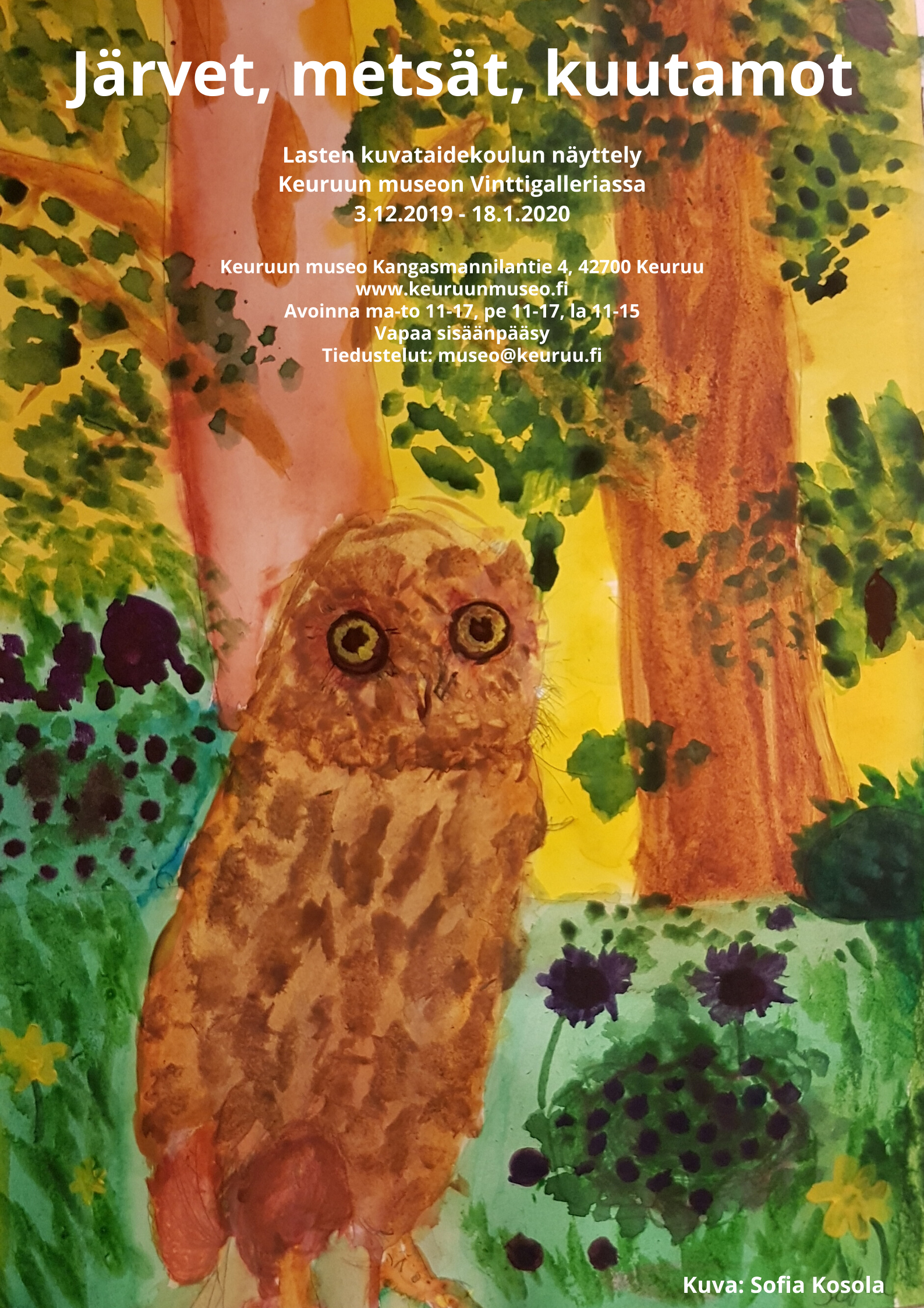 Lasten kuvataidekoulu on esittäytynyt Keuruun museon Vinttigalleriassa ensimmäisen kerran syksyllä 2014. Tämänkertaisen näyttelyn teemana on Järvet, metsät, kuutamot.